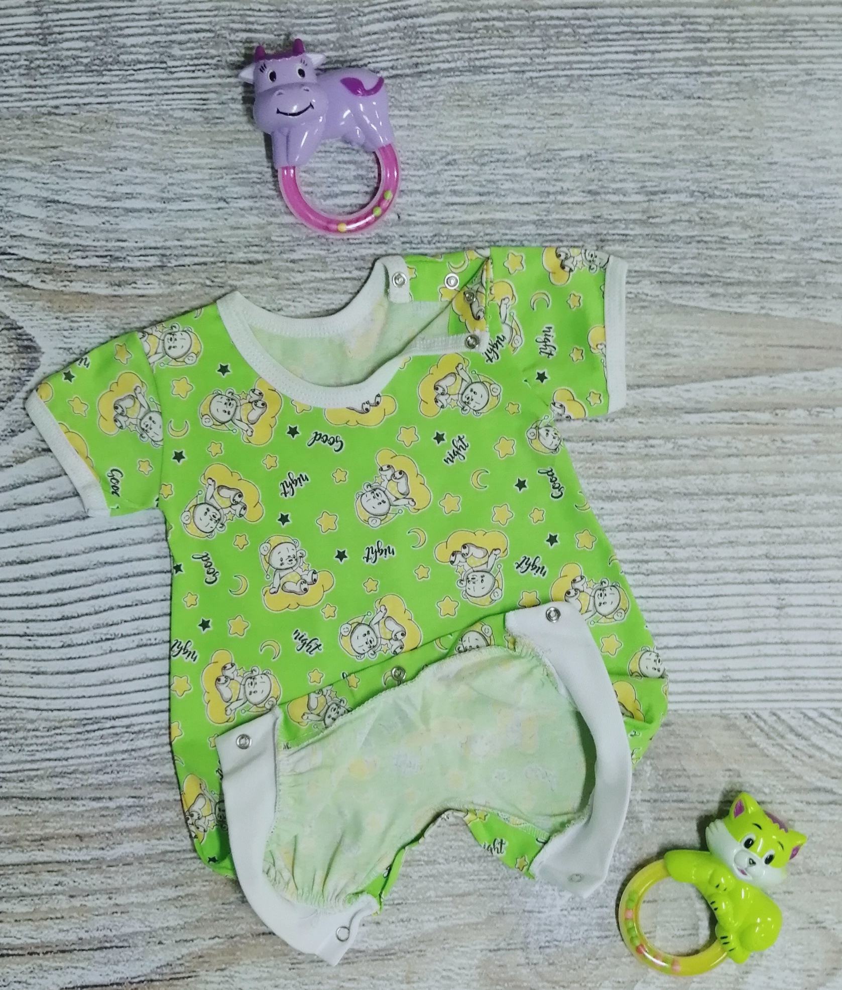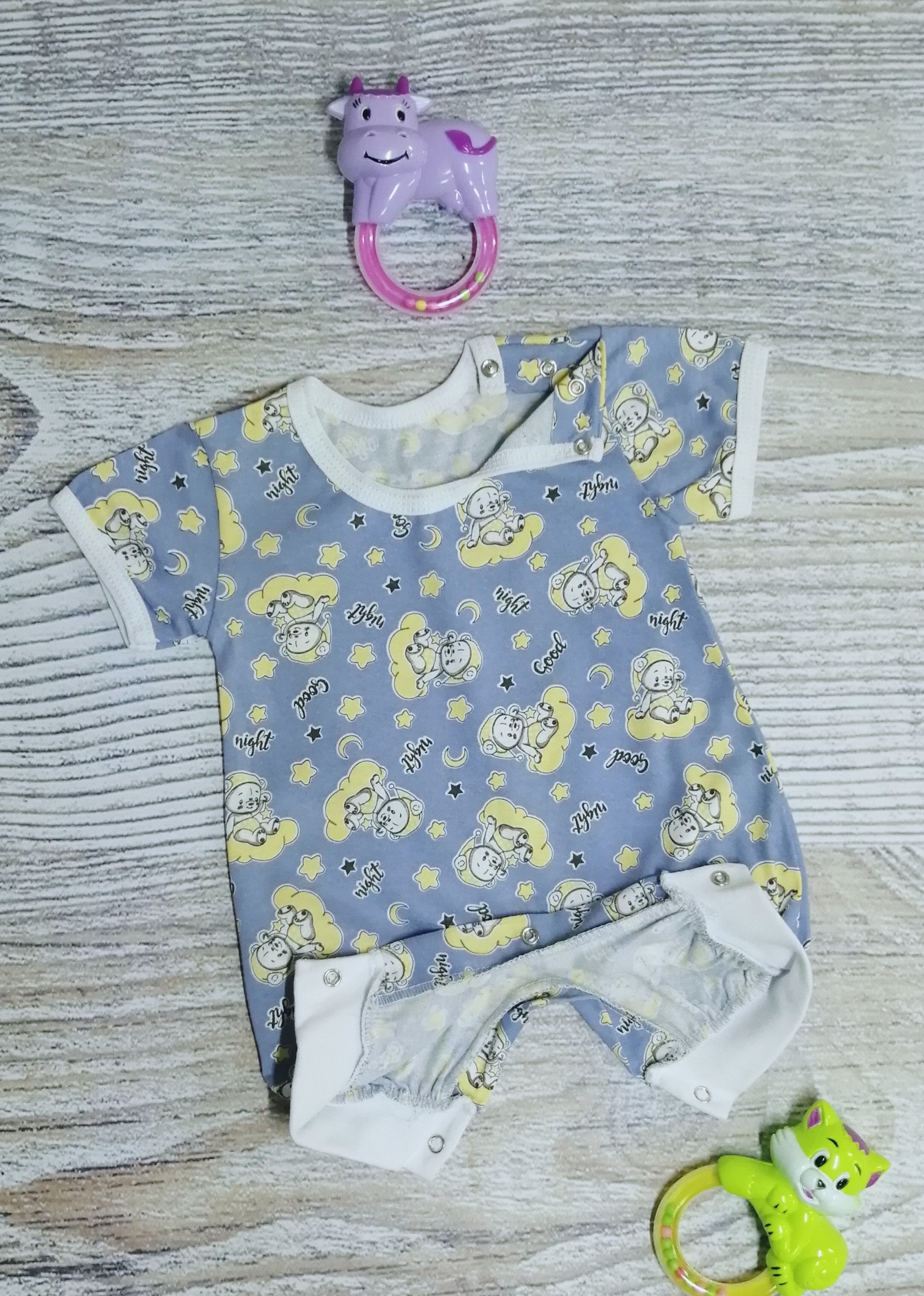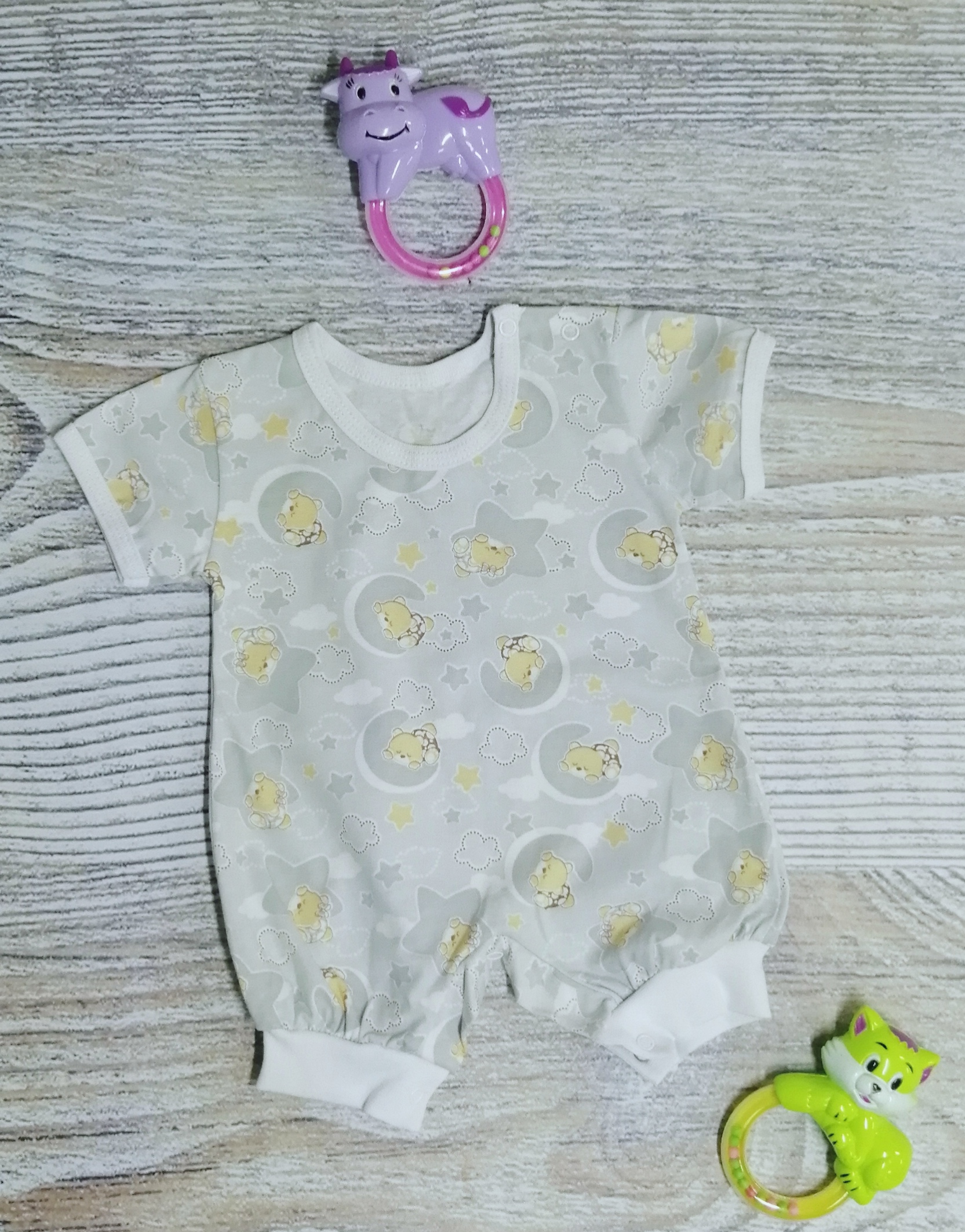 Песочник с коротким рукавом, с кнопочками на одном плече и между ножек.