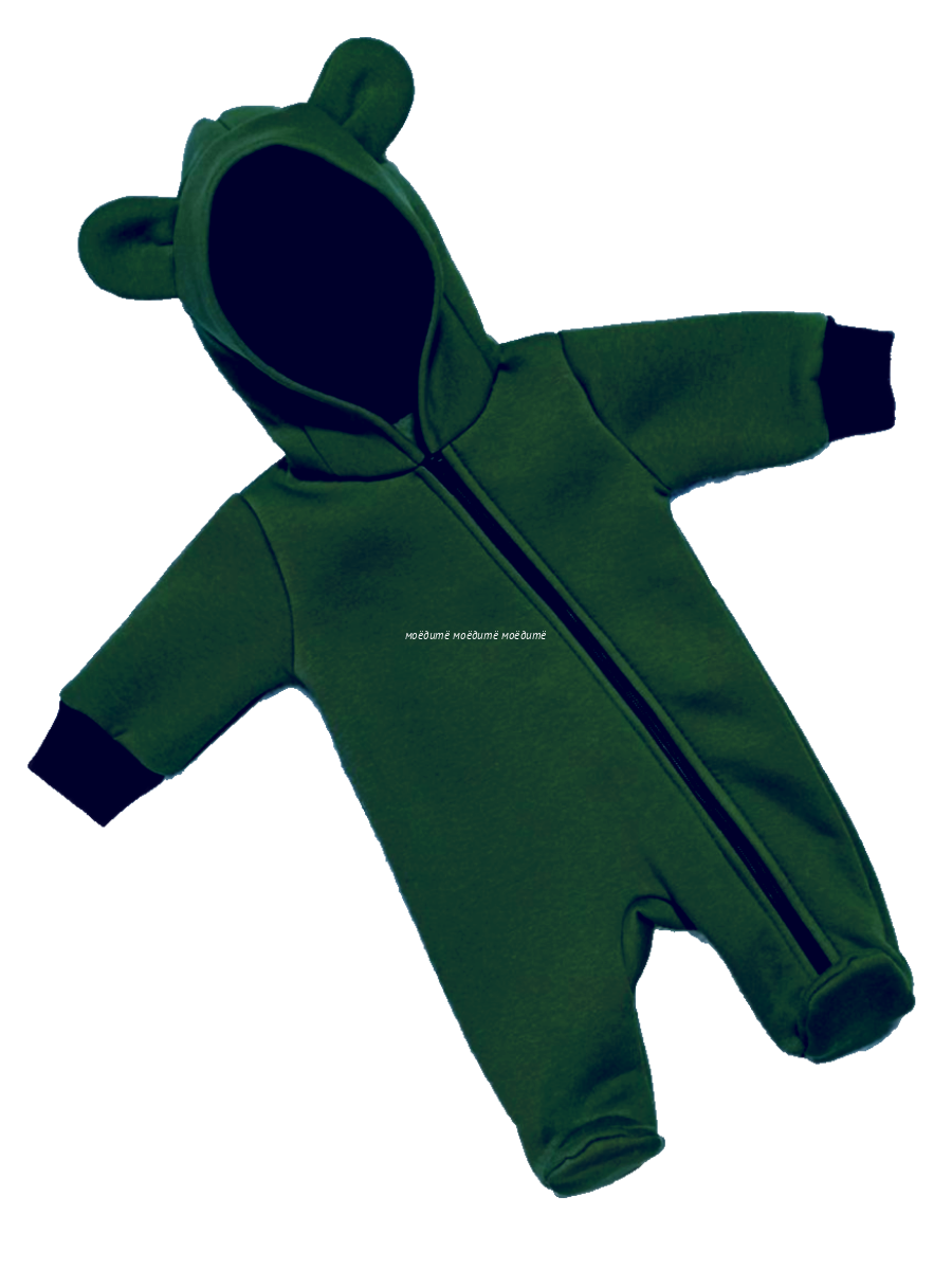 Комбинезон с закрытыми ножками, с капюшоном на подкладке, на молнии по всей длине и до конца одной ножки.