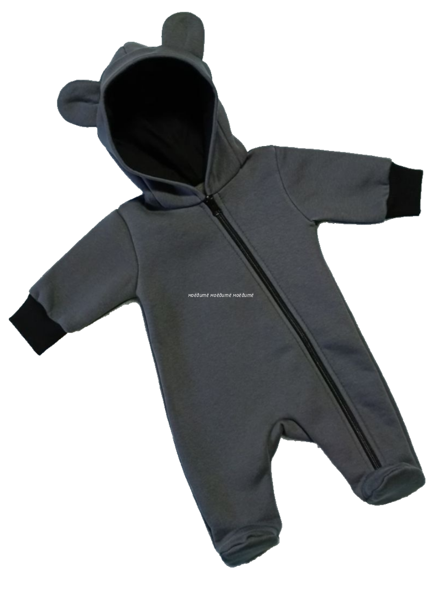 Комбинезон с закрытыми ножками, с капюшоном на подкладке, на молнии по всей длине и до конца одной ножки.